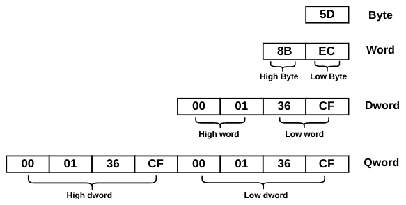 | 64-bit (Qword) | 32-bit (Dword) | 16-bit (Word) | 8 high bits of lower 16 bits | 8 low bits (Byte) |